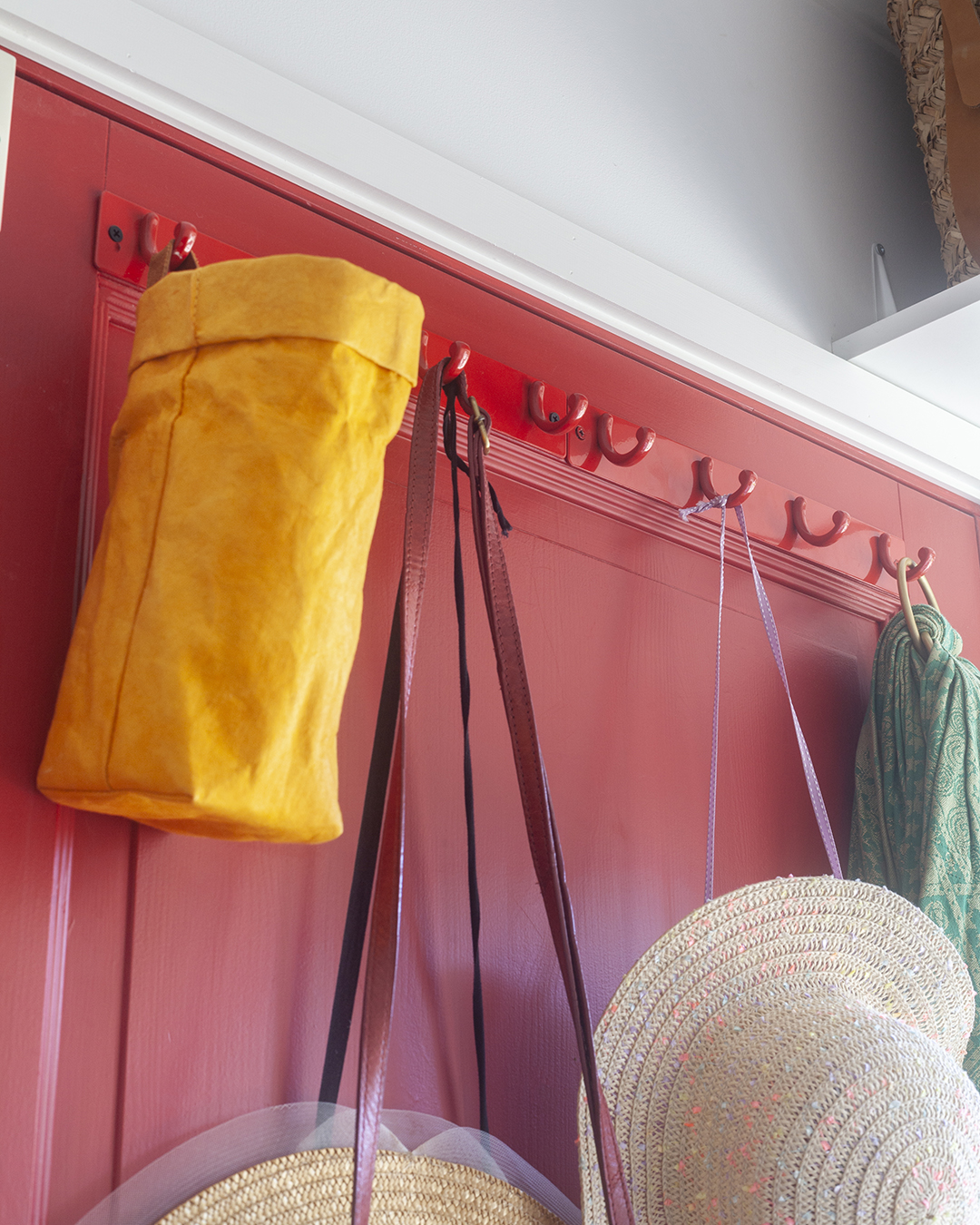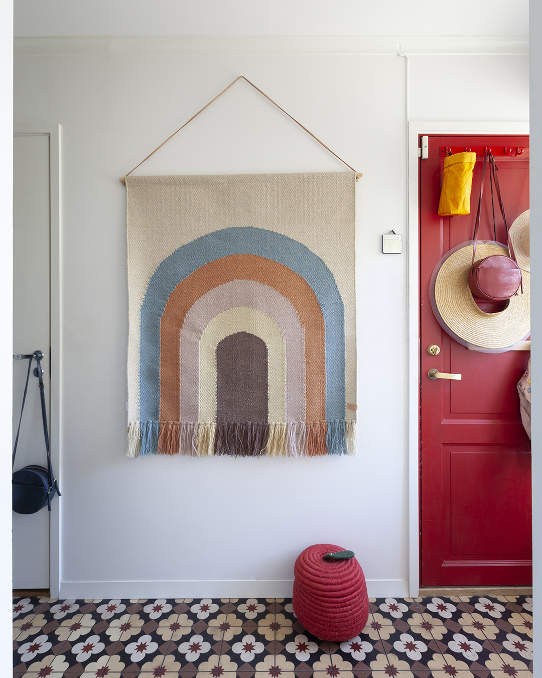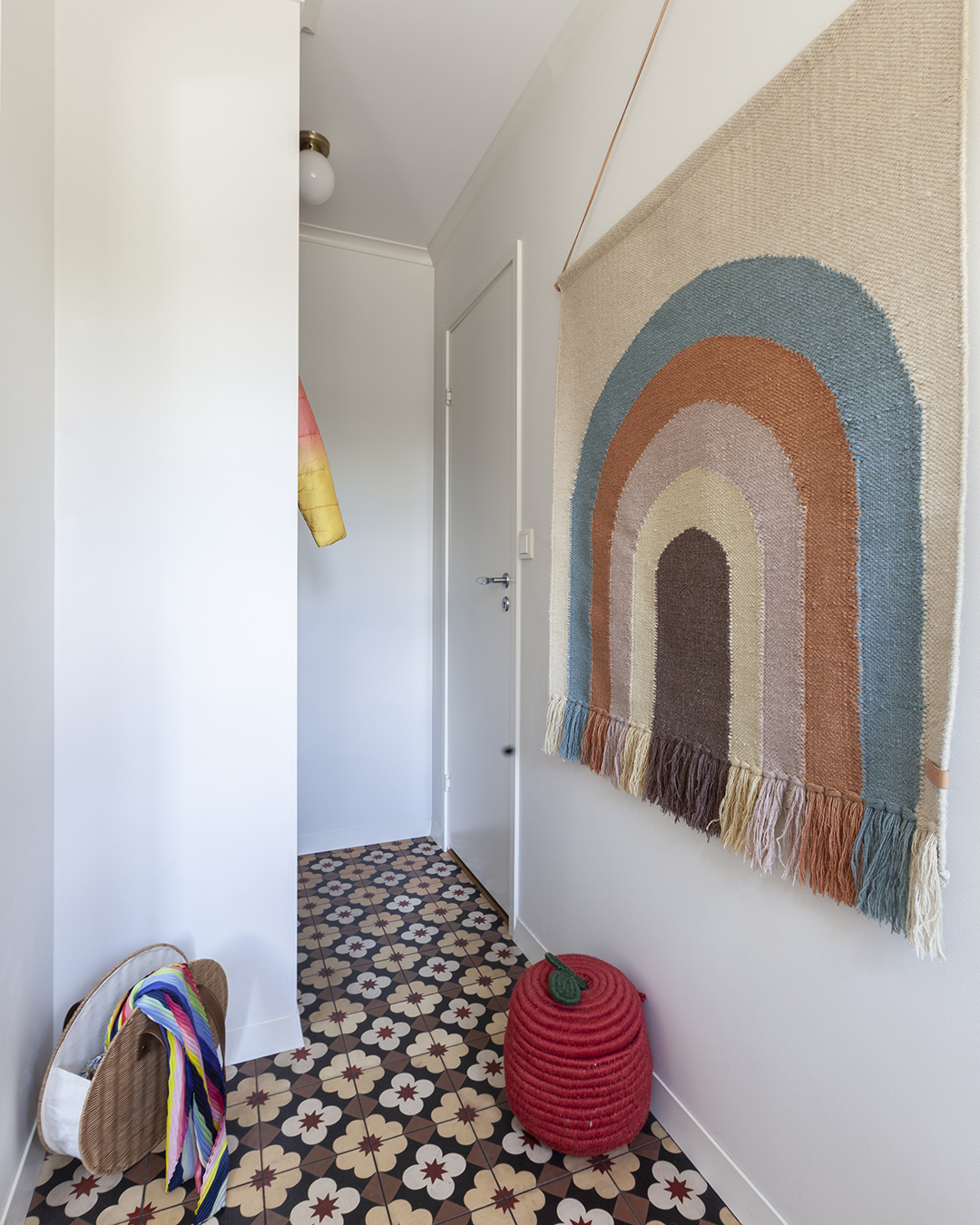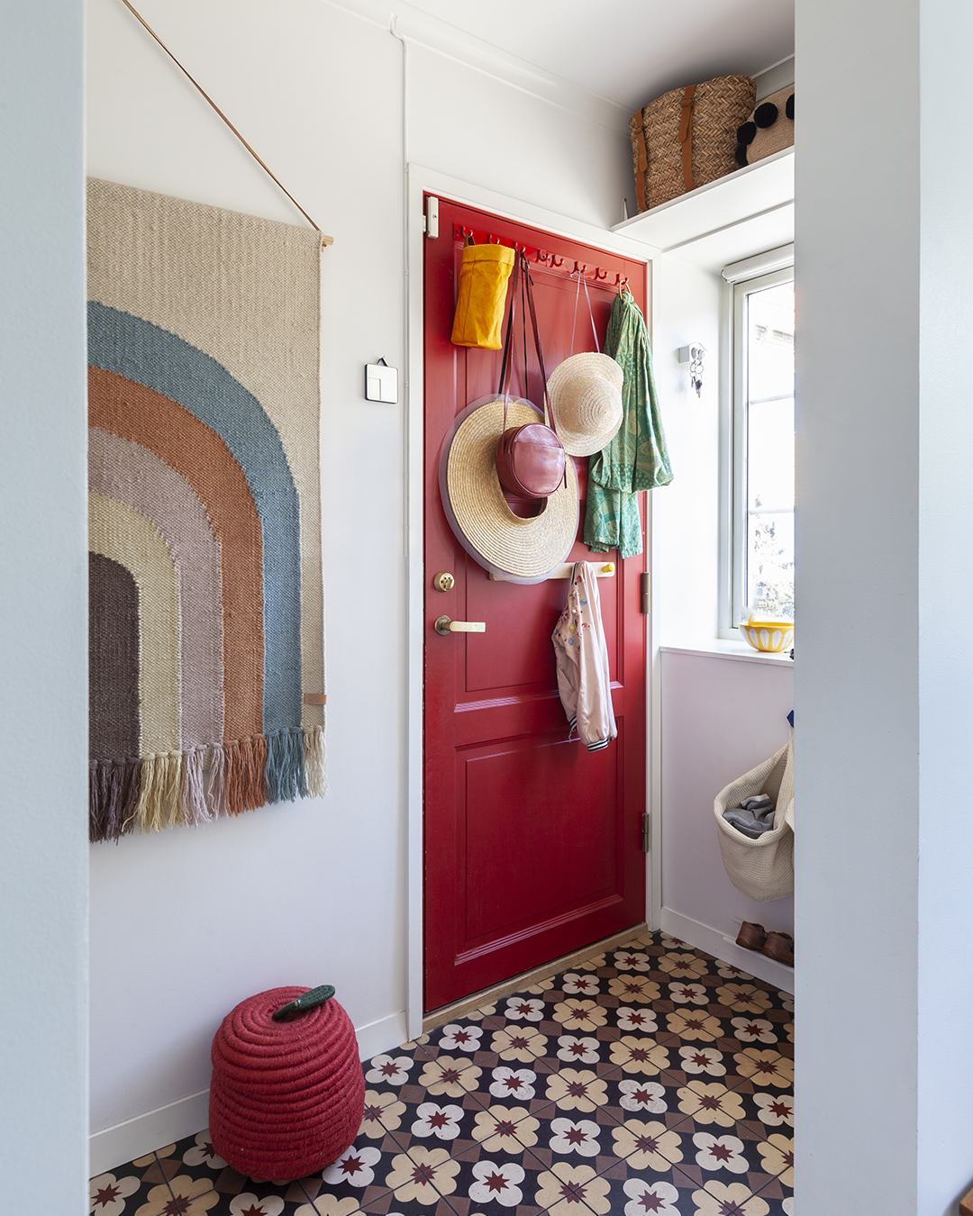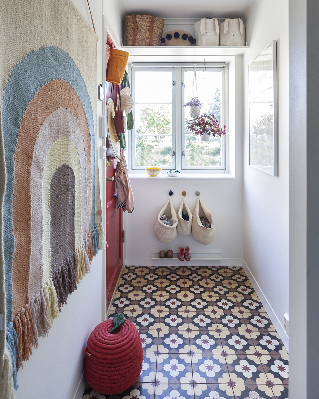 Familie betyr alt for Sarah og siden hun er nostalgisk har hun tatt utgangspunkt i farger og materialer som minner henne om sin egen barndom. – Gammeldagse sementfliser, rødfargen på døren og tekstiler på veggen er en del av dette. Jeg har også forsøkt å få til lekne detaljer som mine egne barn setter pris på som for eksempel regnbuen, fuglehus nøkkelholder og kaninkurver til oppbevaring, som også er praktiske i en travel småbarnsfamilies hverdag, forteller hun.