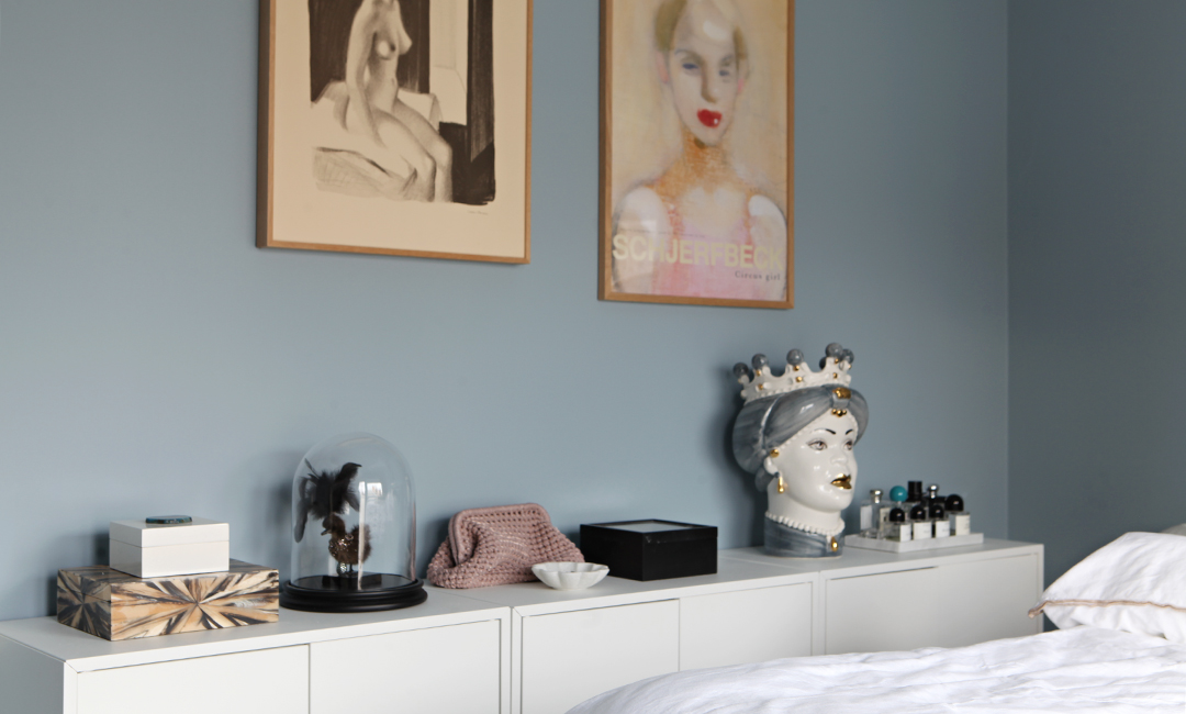 Blått på soverommet oppleves svalt og kjølig, men også beroligende og avstressende. Og hvem elsker vel ikke crispy, hvitt sengetøy i kombinasjon med blåtoner? Da Agneta flyttet inn på Vettakollen for to år siden, etter mange år med urbant byliv på Majorstua, var huset helt hvitt innvendig. Hvite vegger, hvite lamellgardiner, hvit innredning og ikke minst hvitt soverom. – Farger betyr mye for meg og jeg kjente at det nå var på tide å gjøre rommene mindre sterile, og mer meg, forteller hun.