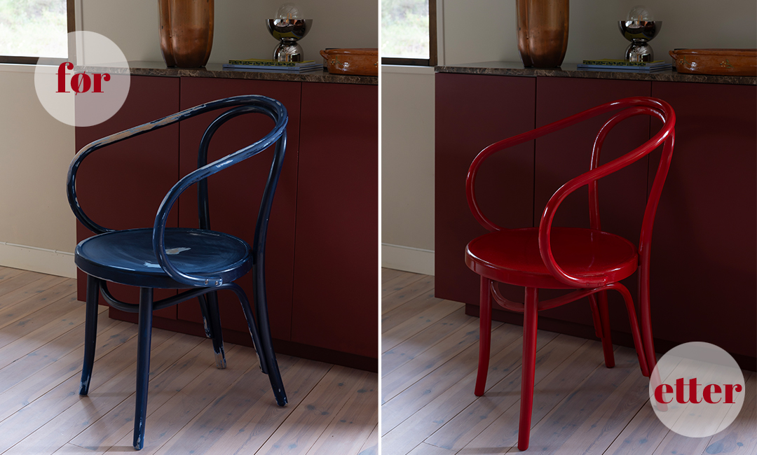 Det sies at rødt gir energi, og stolen vi har malt i 0083 SIGNALRØD har definitivt fått nytt liv og personlighet. I spisestuen representerer rødt appetitt og samvær, og det kan brukes til å skape en innbydende atmosfære.